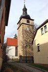 Die Kirche wurde im 15. Jahrhundert errichtet und diente eine Zeitlang als Wehrkirche dem Schutz der Bürger. Durch den Krieg stark beschädigt, wurde sie in der zweiten Hälfte des 17. Jahrhunderts wieder aufgebaut. Im Innenraum beeindruckt der aus reichem Schnitzwerk bestehende und sehr farbenfrohe Kanzelaltar. Er wurde 1725 von dem Erfurter Künstler Valentin Dittmar geschaffen. Auffallend ist der an der Südseite der Kirche stehende Turm. Seine heutige Form erhielt er 1875.